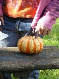 Keywords: child hands dirty girl pumpkin play tinker halloween autumn play outside