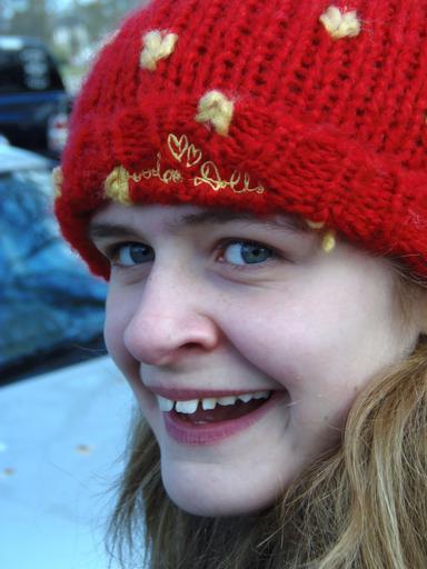 Keywords: child hat wool red female daughter blue eyes face portrait