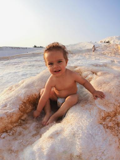 Keywords: child kid girl fun young cute joy summer outdoors little plashing diaper playing baby boy beach sand water waves