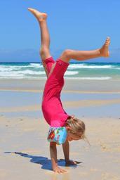 Keywords: child people girl sea ocean uv-resistant clothing handstand gymnastics beach