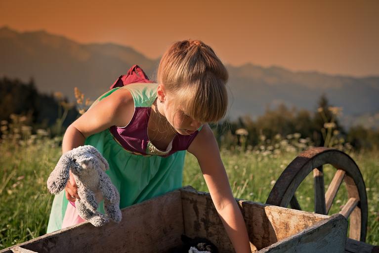 Keywords: childhood child out nature meadow wheelbarrows play leisure girl blond mountains teddy bear
