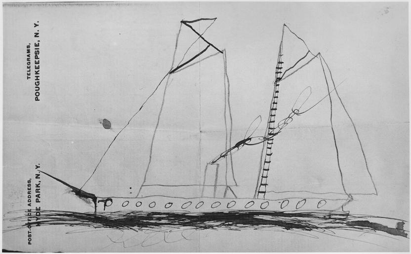 | Keywords: Childhood Drawing of a Sailing Ship by Franklin D. Roosevelt - NARA - 198134.tif Scope and content This item is a pencil drawing of a sailing ship drawn by Franklin D Roosevelt as a child The drawing accompanied a letter Roosevelt wrote to his mother Sara Delano Roosevelt in 1887 The letter reads My dear mama we coasted yesterday nothing dangerous yet look out for tomorrow your boy F A notation on the back of the letter by Roosevelt's mother reads Written by Franklin when 5 years and 11 months old He knew his letters but was told how to spell the words - Jan 1st 1888 General notes 198134 Local identifier Roosevelt Franklin D Franklin Delano 1882-1945 NARA-Author Roosevelt Franklin D Franklin Delano 1882-1945 Artist 1301590 <br /> Franklin D Roosevelt Library NLFDR 4079 Albany Post Road Hyde Park NY 12538-1999 1887 Record group Collection FDR-RFPCH Roosevelt Family Papers Donated by the Children 1686 - 1959 Record group ARC 1187 Franklin D Roosevelt's Letters to His Parents James and Sara Roosevelt compiled 1887 - 1887 Series ARC 198132 File unit Franklin D Roosevelt's Letters to his Parents James and Sara Roosevelt 1887 - 1887 File unit ARC 198133 Variant control numbers NAIL Control Number NLR-RFPCH-FDRTOPARENTS-1887-FDRP3<br /> Other Identifier 08945<br /> This is the NARA Internal Exhibit Tracking Number for the Public Vaults exhibit yes Other versions <gallery> File Childhood_Drawing_of_a_Sailing_Ship_by_Franklin_D _Roosevelt_-_NARA_-_198134 tif tif File Childhood_Drawing_of_a_Sailing_Ship_by_Franklin_D _Roosevelt_-_NARA_-_198134 jpg jpg </gallery> NARA-cooperation PD-USGov Franklin Delano Roosevelt in 1887 Pencil drawings Line drawings of ships NARA TIF images with categorized JPGs |