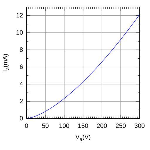| Keywords: ChildLangmuirLawGraph1.svg  python <syntaxhighlight lang python > from matplotlib pyplot import from math import sqrt from numpy import linspace fig figure figsize 4 4 ax1 fig add_subplot 111 ax1 grid True A 1e-4 cathode are 1 cm 2 d 1e-2 cathode-anode distance 1cm Va linspace 0 300 100 e 1 6e-19 electronic charge m 9 11e-31 electronic mass e0 8 85e-12 permitivitty of free space def childLaw V return 4 e0 sqrt 4 e/m A V 1 5/ d 2 9 Ia childLaw Va ax1 plot Va Ia ax1 grid True ax1 set_xlabel r V_a ax1 set_ylabel r I_a fig show fig savefig ChildLangmuirLawGraph1 svg bbox_inches tight \ pad_inches 15 </syntaxhighlight> sr П иказан је г аф Чајлд-Лангмуи овог закона то јест овисност анодне ст ује о анодном напону за идеализи ану вакуумску диоду Пов шина катоде А 1 cm2 удаљеност катода-анода d 1 cm Ко иштена фо мула је из чланка Те моелект онска емисија на с пској википедији own Krishnavedala 2011-06-04 File ChildLangmuirLawGraph1 png validSVG Cc-zero Vacuum tube diagrams Images with Python source code Created with Matplotlib Device current-voltage characteristics |