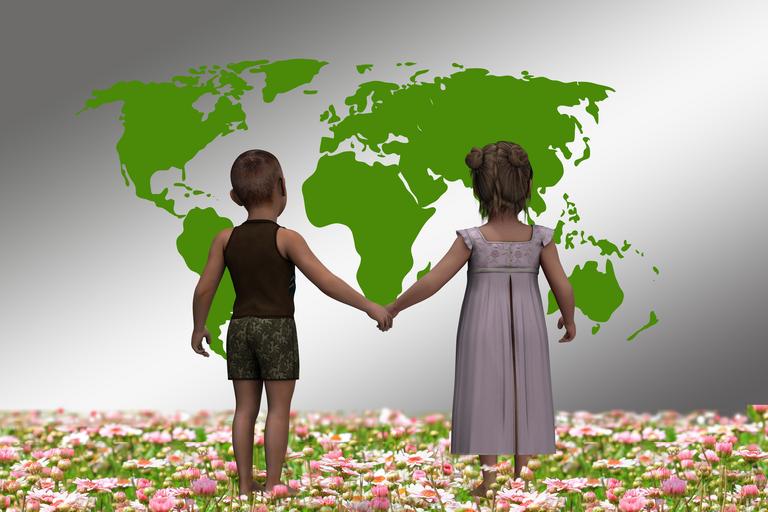 Keywords: children forward universe earth planet world hand in hand continents europe asia africa clouds star peaceful affection play girl boy friends go digital art