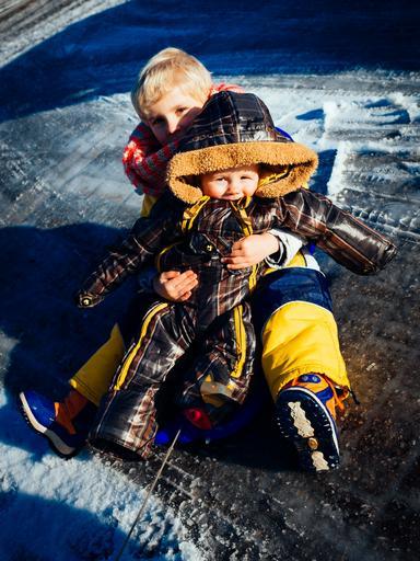 Keywords: children playing winter snow slide happy fun young cute childhood friends kid smiling joy together outdoors little