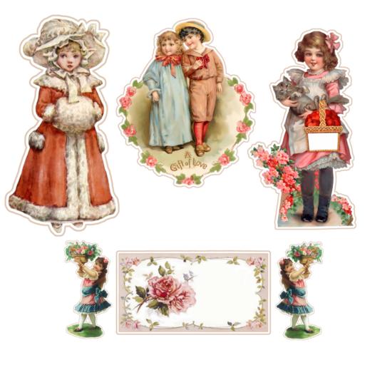Keywords: children stickers cutouts scrapbook scrapbooking victorian vintage boy girl cat kitten pink rose flower floral bouquet design wreath heart basket elements banner calling card frame