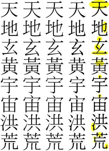 Keywords: Chinese standard variants samples.svg Chinese characters in standardized Ming typefaces and characters found in the Kangxi Dictionary From right to left are Kangxi Dictionary forms Mainland China standard Hong Kong standard Taiwan standard Japan standard Areas in the rightmost column where there are significant differences among different standards are highlighted in yellow 玄 is not written completely in the Kangxi Dictionary because 玄 is a character in the Kangxi Emperor's given name 玄燁 It was taboo to write a character the emperor's name and so 玄 was left incomplete own Asoer 2010-05-21 Comparisons of different sets of Chinese characters ImageNote 1 400 196 8 8 418 576 2 玄 is written this way in the Kangxi Dictionary because 玄 is a character in the Kangxi Emperor's given name 玄燁 It was taboo to write a character the emperor's name and so 玄 was left incomplete ImageNoteEnd 1 ImageNote 2 405 14 8 8 418 576 2 Note lengths of horizontal strokes ImageNoteEnd 2 ImageNote 3 398 103 8 8 418 576 2 Variation between a vertical stroke with a hook and a 丿 ImageNoteEnd 3 ImageNote 4 378 147 8 8 418 576 2 Variation between using a vertical stroke and 丶 ImageNoteEnd 4 ImageNote 5 364 180 8 8 418 576 2 Variation between using a contiguous or separate 丶 and ImageNoteEnd 5 ImageNote 6 379 237 8 8 418 576 2 Note top being 廿 or 卄 and whether it is 由 or 田 below the long horizontal stroke ImageNoteEnd 6 ImageNote 7 384 293 8 8 418 576 2 Variation between using a vertical stroke and 丶 ImageNoteEnd 7 ImageNote 8 384 363 8 8 418 576 2 Variation between using a vertical stroke and 丶 ImageNoteEnd 8 ImageNote 9 350 483 8 8 418 576 2 Variation at the beginning of the stroke ImageNoteEnd 9 ImageNote 10 381 508 8 8 418 576 2 Note connected or disconnected 艹 and in 亡 using a vertical stroke or 丶 ImageNoteEnd 10 ImageNote 11 359 534 8 8 418 576 2 Note corner or curve ImageNoteEnd 11 ImageNote 12 402 548 8 8 418 576 2 Note presence or absence of hook ImageNoteEnd 12 ImageNote 13 361 523 8 8 418 576 2 Note whether or not the horizontal stroke passes the vertical stroke ImageNoteEnd 13 |