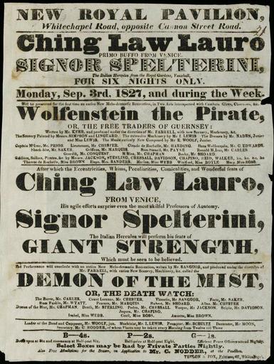 | Keywords: Ching Lau Lauro1827.jpg New Royal Pavilion Whitechapel Road London poster of Monday 3 September 1827 advertising the magician Ching Lau Lauro name mis-spelt http //www elta-project org/fedora-stg/get/elta 1136/JPEG_800_001 jpg 1827-09-03 Anon PD-old-70-1923 Ching Lau Lauro Entertainment in the United Kingdom Playbills of the United Kingdom |