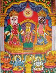 Keywords: Chore Bagan Art Studio Jagannath.jpg en Colour lithograph lettered inscribed and numbered 51 Jagannatha considered to be a form of Krishna worshipped at Puri in Orissa is enthroned with his brother Balarāma to his right and their sister Subhadrā to the left Brahma Vishnu Garuda and two representations of Shiva are in the foreground http //www britishmuseum org/research/search_the_collection_database/search_object_details aspx objectid 3276400 partid 1 searchText jagannatha fromADBC ad toADBC ad numpages 10 images on orig 2fresearch 2fsearch_the_collection_database aspx currentPage 2 Chore Bagan Art Studio ~ 1895 PD-art Jagannath Balabhadra Subhadra Jagannath |