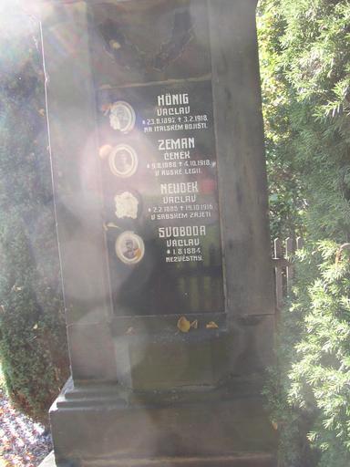 Keywords: Chrastany Podsedice LT CZ WWI memorial 108.jpg Chrášťany okres Litoměřice Pomník padlým v 1 světové válce na západní straně dolejší návsi Detail pravé severní strany Chrášťany Litoměřice District Czech Republic World War I memorial Close-up of right nortern side Author's notice The image of this side is of very unsatisfactory quality due to poor light conditions at time of it creation Feel free to overwrite this file by a better one <gallery> File Chrastany_Podsedice_LT_CZ_WWI_memorial_103 jpg E File Chrastany_Podsedice_LT_CZ_WWI_memorial_105 jpg E detail File Chrastany_Podsedice_LT_CZ_WWI_memorial_106 jpg S detail </gallery> 50 28 33 1 N 13 55 39 4 E type landmark_region CZ 0 cellpadding 15 cellspacing 0 align center style text-align center; background gray; color yellow - text-align center; 0 cellpadding 15 cellspacing 0 style text-align center; background black; color white - text-align center; <big>KLEIN </big><br /> ADOLF <br /> <small> 19 5 1887 17 9 1914 </small> <br /> <small>NA SRBSKÉM BOJIŠTI </small> <br /><br /> <big>MERHOUT </big><br /> VÁCLAV <br /> <small> 23 9 1895 6 8 1915 </small> <br /> <small>NA RUSKÉM BOJIŠTI </small> <br /><br /> <big>MARTINOVSK </big><br /> ANTONÍN <br /> <small> 11 6 1885 8 6 1916 </small> <br /> <small>NA RUSKÉM BOJIŠTI </small> <br /><br /> <big>HÖNIG </big><br /> OLDŘICH <br /> <small> 1 4 1886 27 1 1917 </small> <br /> <small>NA RUSKÉM BOJIŠTI </small> <br /><br /> <big>HÖNIG </big><br /> JOSEF <br /> <small> 25 1 1895 22 11 1917 </small> <br /> <small>NA ITALSKÉM BOJIŠTI </small> 0 cellpadding 15 cellspacing 0 style text-align center; background gray; color yellow - text-align center; <big><b>1914 1918</b></big> <br /><br /> 0 cellpadding 15 cellspacing 0 style text-align center; background black; color white - text-align center; POKLEKNI POKORNĚ <br /> NÁRODE CEL <br /> OSLAVUJ HRDINY <br /> JIŽ PSALI DĚJINY <br /> CO ZA TVOU <br /> SVOBODU <br /> VYKRVÁCELI <br /><br /> <br /><br /><br /> 0 cellpadding 15 cellspacing 0 style text-align center; background black; color white - text-align center; K UCTĚNÍ PAMÁTKY PADL CH VOJÍNŮ <br /> VĚNUJE ODBOR NÁRODNÍ JEDNOTY <br /> SEVEROČESKÉ V CHRÁŠŤANECH <br /> A OBČANSTVO <br /> <big> 19</big> <small>23 /7 </small> <big>22 </big> 0 cellpadding 15 cellspacing 0 style text-align center; background black; color white - text-align center; <big>HÖNIG </big><br /> VÁCLAV <br /> <small> 23 8 1897 3 2 1918 </small> <br /> <small>NA ITALSKÉM BOJIŠTI </small> <br /><br /> <big>ZEMAN </big><br /> ČENĚK <br /> <small> 9 8 1888 4 10 1918 </small> <br /> <small>V RUSKÉ LEGII </small> <br /><br /> <big>NEUDEK </big><br /> VÁCLAV <br /> <small> 2 2 1885 19 10 1916 </small> <br /> <small>V SRBSKÉM ZAJETÍ </small> <br /><br /> <big>SVOBODA </big><br /> VÁCLAV <br /> <small> 1 8 1884 </small> <br /> <small>NEZVĚSTN </small> <br /><br /> Chrášťany Podsedice World War I memorials in Litoměřice District |