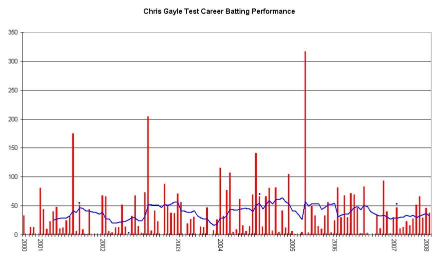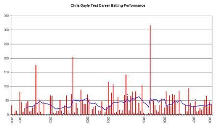 Keywords: Chris Gayle Graph.png Test Match performance of Chris Gayle It was created by Raven4x4x The red bars indicate the player's test match innings while the blue line shows the average of the ten most recent innings at that point Note that this average cannot be calculated for the first nine innings The blue dots indicate innings in which Gayle finished not-out This graph was generated with Microsoft Excel 2002 using data from Cricinfo http //stats cricinfo com/statsguru/engine/player/51880 html class 1;orderby start;template results;type batting;view innings and Howstat http //www howstat com au/cricket/Statistics/Players/PlayerProgressBat asp PlayerID 2217 The information in this chart is current as of 28 January 2008 2005-12-2 Own <br />Transferred from http //en wikipedia org en wikipedia Raven4x4x at http //en wikipedia org en wikipedia en wikipedia Raven4x4x Original upload log page en wikipedia Chris_Gayle_Graph png 2005-12-02 02 45 Raven4x4x 963×492 5580 bytes <nowiki>This graph details the Test Match performance of Chris Gayle It was created by Raven4x4x The red bars indicate the player's test match innings while the blue line shows the average of the ten </nowiki> 2006-04-23 04 29 Raven4x4x 957×539 5809 bytes <nowiki>updated graph</nowiki> 2006-07-03 06 17 Raven4x4x 963×492 5767 bytes <nowiki>updated The information in this graph is current as of 3 July 2006 </nowiki> 2006-12-03 00 01 Raven4x4x 986×540 5052 bytes <nowiki>Updated The information in this graph is current as of 3 December 2006</nowiki> 2007-06-20 07 33 Raven4x4x 986×574 5416 bytes <nowiki>Updated The information in this chart is current as of 20 June 2007 </nowiki> 2008-01-28 00 36 Raven4x4x 986×574 5393 bytes <nowiki>Updated The information in this chart is current as of 28 January 2008 </nowiki> Chris Gayle Cricket graphs |