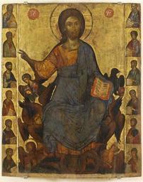 | Keywords: Christ in glory with apostles (14th c., Constantinople).jpg Ο Χριστός εν δόξη και οι δώδεκα Α όστολοι μέσα 14ου αιώνα 78x96εκ άγνωστος ζωγράφος α ό την Κωνσταντινού ολη Εδόθη μοι άσα εξουσία εν ουρανώ και ε ί της γης Πορευθέντες μαθητεύσατε άντα τα έθνη ατθ 28 18-19 κείμενο στο ευαγγέλιο ου κρατάει ο Χριστός Ο Χριστός εικονίζεται καθισμένος σε θρόνο α ό σεραφείμ ευλογεί με το δεξί του χέρι και κρατάει ανοιγμένο ευαγγέλιο με το αριστερό Περιβάλλεται α ό τα σύμβολα των ευαγγελιστών και α ό τους δώδεκα α οστόλους οι ο οίοι αριστάνονται σε ροτομή και βρίσκονται σε δύο στενές στήλες δεξιά και αριστερά του http //eib xanthi ilsp gr/gr/icons asp cursort iconTitle selectFieldValue vpage 3 mid 14th century Constantinople master PD-old Files uploaded by Shakko from various sources 14th-century icons of Byzantine Empire Icons of Christ Pantocrator enthroned Icons of apostles Icons with saints on the margins |