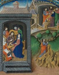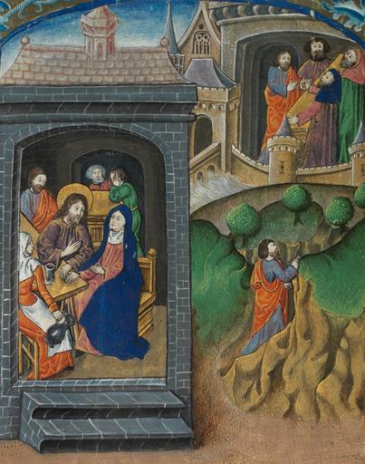 Keywords: Christ tells his mother of what is to come; Judas on his way to the chief priest; Judas bargaining with the chief priests and receiving his silver (f. 27v) Cropped.jpg author Vaux Passional Illumination on parchment Christ tells his mother of what is to come; Judas on his way to the chief priest; Judas bargaining with the chief priests and receiving his silver c 1503-4 This digital image can be seen in its original context https //www llgc org uk/discover/digital-gallery/digitalmirror-manuscripts/the-middle-ages/the-vaux-passional/ here Cc-zero object history Peniarth 482D is a manuscript written by one scribe on parchment probably in London either in the late 15th century or at the beginning of the 16th As in the case of Peniarth MS 481D The Battles of Alexander the Great it is one of the most elaborately decorated medieval manuscripts in the Library and a rare survival in its original binding Its importance also lies in its connection to the Royal households of Henry VII and Henry VIII See full version of this page <br/> <br/> Peniarth 482D Vaux Passional Images uploaded as part of NLW - WMUK collaboration Uploaded with UploadWizard Miniatures of Judas Iscariot Pact of Judas |