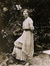 Keywords: the women's library thewomenslibrary lse library lselibrary suffrage suffragette uk christabel pankhurst christabelpankhurst garden white dress whitedress hires outdoor 7JCC/O/02/115a Photograph, printed, paper, monochrome, Christabel Pankhurst standing in a garden wearing a belted white dress printed with a motif of circles, full length, front profile; printed inscription on reverse '- Record Press, 29 Fetter Lane, London EC' 7JCC/O/02/115a Photograph, printed, paper, monochrome, Christabel Pankhurst standing in a garden wearing a belted white dress printed with a motif of circles, full length, front profile; printed inscription on reverse '- Record Press, 29 Fetter Lane, London EC'
