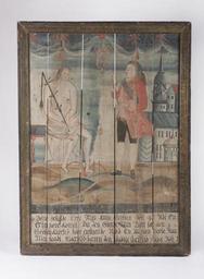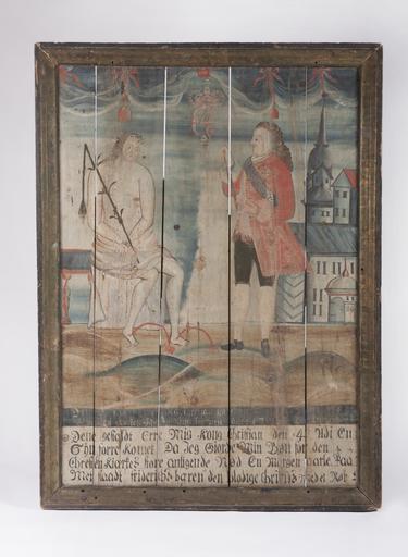 Keywords: Christian IV's syn - Norsk Folkemuseum - NF.1901-0352.jpg Deponert fra Tranby kirketilsyn Motiv Christian IV's syn Kongens monogram i hvitt og rødt Kong Christian er kledd i frakk knebukser og strømper Arkitektur i bildets høyre bakgrunn Draperier i bildets øvre kant Kristus sitter pÃ¥ en skammel til venstre i bildet iført et lendeklede mens blod strømmer ut av sÃ¥r i kroppen Bærer et knekket hveteaks Innskrift PÃ¥skrift Øverste pÃ¥skrift Dene Tavle har Jeg Christian Lorensen lavet - giort og Givet til Kiærken - Til min Ringe formue aar 178 Til Tranebye PÃ¥skrift Nederste pÃ¥skrift Dene gestaldt Erre Mig Kong Christian den 4 Udi En Syn forre Komet Da Jeg Giorde Min Bøn for den Chrestenkiærkes store anligende Nød En Morgen aarle Paa met slaadt friderichsværen den blodige Christus med et Rør Inventarnr NF 1901-0352 NF NF 1901-0352 maleri 1780 1789 Christian Lorensen / Photo Haakon Michael Harriss / Norsk Folkemuseum PD-old-100 Christian IV of Denmark 1814 “ Spillet om Danmark og Norge Collections of Norsk Folkemuseum Photographs by Haakon Harriss