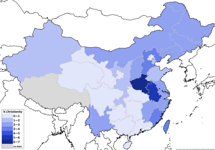 | Keywords: Christianity in China 2010s.png Distribution of Christians in China in the 2010s by province according to CGSS 2009 and CFPS 2012 China General Social Survey 2009 results reported in https //baylor-ir tdl org/baylor-ir/bitstream/handle/2104/9326/WANG-THESIS-2015 pdf sequence 1 Xiuhua Wang 2015 p 15 ; Chinese Family Panel Studies 2012 for Shanghai Guangdong Henan Liaoning and Gansu report http //iwr cass cn/zjwh/201403/W020140303370398758556 pdf 当代中国宗教状况报告 基于CFPS 2012 调查数据 p 013 2015-09-14 Aethelwolf Emsworth Allowed to copy and distribute Religion maps of China Christianity in China |
