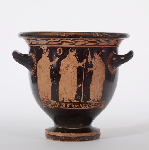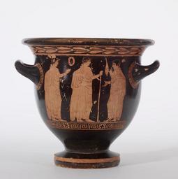 Keywords: Christie Painter - Red-Figure Bell Krater - Walters 4874 - Side B.jpg The wine-god Dionysus appears often on vases of this shape called a bell krater which held wine for drinking parties He is usually shown as a bearded and majestic god Here Dionysus holds a thyrsus a pole often twined with ivy and grapevines and topped with a pine cone in one hand and a kantharos a high-handled drinking cup in the other He turns his head to gaze at a maenad who follows while a satyr playing the double flutes leads the procession The maenad carries an oinochoe a wine jug and a lighted torch indicating that the group's journey takes place at night ca 440 BC Classical terracotta cm 29 2 34 30 8 accession number 48 74 29124 Don Marcello Massarenti Collection Rome cat no 170 Henry Walters city Baltimore Walters Art Museum Henry Walters Acquired by Henry Walters with the Massarenti Collection 1902 place of origin Athens Greece Walters Art Museum license Ancient Greek red-figure pottery in the Walters Art Museum Christie Painter Media contributed by the Walters Art Museum needs category review Media contributed by the Walters Art Museum needs artist update |