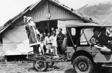Keywords: christmas australian war memorial australianwarmemorial history world war ii worldwarii christmas across the commons christmasacrossthecommons christmas 1943 christmas1943 blackandwhite monochrome outdoor black and white ID Number: 062771 Maker: Stuckey, Norman Bradford Ramu Valley, New Guinea. NX103434 Captain F. D. Smith, dressed as Father Christmas, arriving at one of the wards of the main dressing station, 2/6th Australian Field Ambulance, in a jungle cart (Thompson Stretcher), drawn by a jeep, to distribute Christmas presents to the patients. Identified personnel are: SX28258 Private E. J. Cummings; TX5952 Private R. G. Viney, and Corporal R. Roessler. Rights Info: No known copyright restrictions. This photograph is from the Australian War Memorial's collection www.awm.gov.au Persistent URL: cas.awm.gov.au/photograph/062771 ID Number: 062771 Maker: Stuckey, Norman Bradford Ramu Valley, New Guinea. NX103434 Captain F. D. Smith, dressed as Father Christmas, arriving at one of the wards of the main dressing station, 2/6th Australian Field Ambulance, in a jungle cart (Thompson Stretcher), drawn by a jeep, to distribute Christmas presents to the patients. Identified personnel are: SX28258 Private E. J. Cummings; TX5952 Private R. G. Viney, and Corporal R. Roessler. Rights Info: No known copyright restrictions. This photograph is from the Australian War Memorial's collection www.awm.gov.au Persistent URL: cas.awm.gov.au/photograph/062771 |
