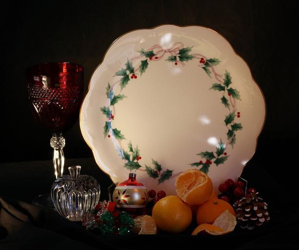 Keywords: christmas still life holiday cake plate tangerines goblet apple ornaments decorations xmas pine cone berries