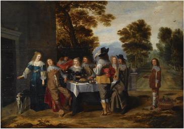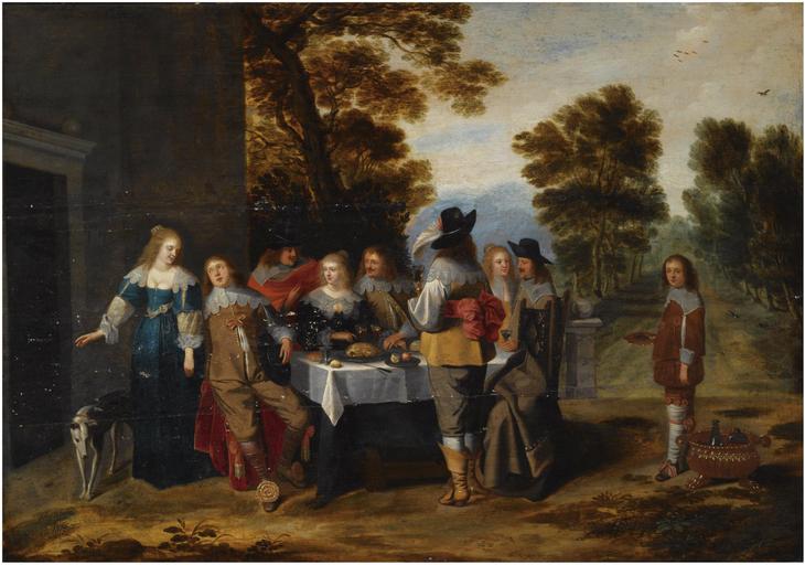 Keywords: Christoffel Jacobsz. van der Laemen - An elegant company seated around a set table on a terrace, a formal garden beyond.jpg Artwork Creator Christoffel Jacobsz van der Laemen 1642 oil wood cm 55 6 80 1 accession number object history credit line signed and dated lower centre van de Lamen fecit 1642 Sold at Sotheby's on 11 November 2008 London lot 67 http //www sothebys com/en/auctions/ecatalogue/2008/old-master-paintings-am1057/lot 67 html PD-old-100 Christoffel Jacobsz van der Laemen Merry companies by Christoffel Jacobsz van der Laemen |