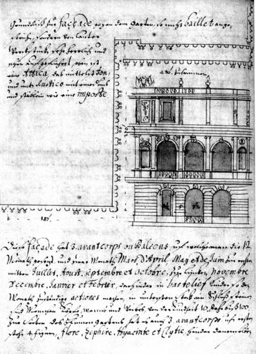 Keywords: Christoph Pitzler Reisetagebuch Folio 132.jpg de Christoph Pitzler Reisetagebuch 1685-1688 Folio 132 Versailles Gartenfassade<br> GrundRiß zur Faççade gegen dem Garten so nicht baillet ange ž strichn sondern von lauter Werckstücken sehr herrlich und schön aufgeführet oben ist eine Attica das mittelst Ion und unten Rustico mit einen Sims und stäblein wie eine imposte<br> Diese Façade hat 3 avantcorps ou Balcons uf welche man die 12 Monath gesezt und zwar Monath Mars d ™Avril May et de Juin zur rechten mitten Juillet Aoust Septembre et Octobre zur linken Novembre Decembre Janvier et Febrier darhinder in bas relief Kinder so den Monath zuständige actiones machen in untersten Stock in Schloßsteinen sind Menschen Köpfe Manns und Weibes von der Kindheit 10 Jahr biß 100 Zur Seiten des Blumen Gartens hat es auch 3 avantcorps ufn ersten stehen 4 Figuren Flore Zephire Hyacinte et Clytie hinder denenselben 1688 Christoph Pitzler « Étude du voyage en France et du séjour à Versailles de Christoph Pitzler extrait de son carnet d ™esquisses 1685-1688 conservé à la Stiftung Preußische Schlösser und Gärten Berlin-Brandenburg » Bulletin du Centre de recherche du château de Versailles En ligne 2014 mis en ligne le 25 septembre 2014 consulté le 13 novembre 2016 URL http //crcv revues org/12347 ; DOI 10 4000/crcv 12347 Christoph Pitzler other versions Custom license marker 2016 11 13 PD-Old Christoph Pitzler Historical images of the Palace of Versailles