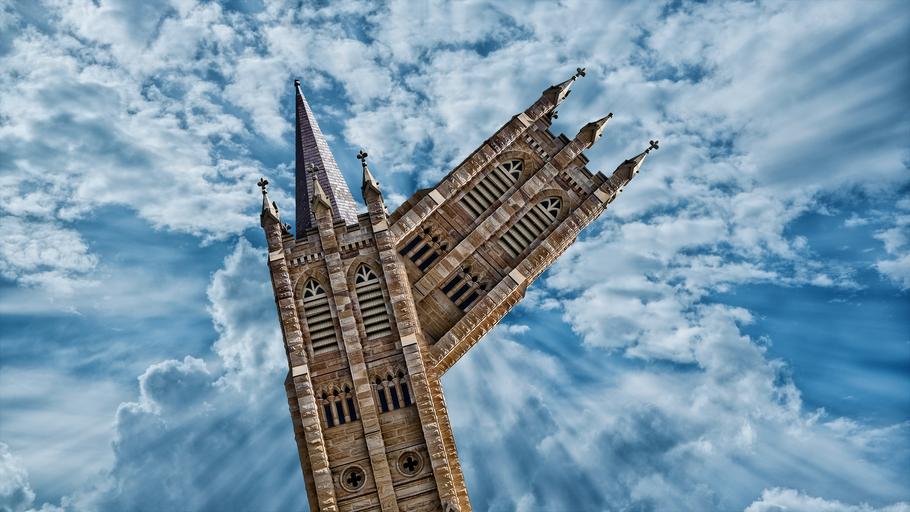Keywords: church abstract steeple light religion sky clouds rays urban symbol remix architecture city building shape model industry parallel universe dimension inception zoom