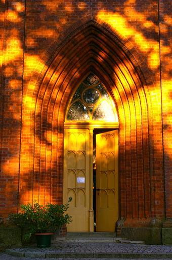 Keywords: church house of worship architecture building religion chapel faith contrast dark rays twilight sun sunset light evening sky outline atmospheric orange mood sunbeam shadow input church entrance bricks romantic afterglow evening sunlight atmosphere ray of hope mysterious mystical lichtblick mood fairytale discoloration shadow play middle ages fantastic history nature