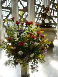 Keywords: church jewelry bouquet colorful glass concrete wall thick glass window fields stele with st george sculpture church rear tender frisch fromm cheerful free