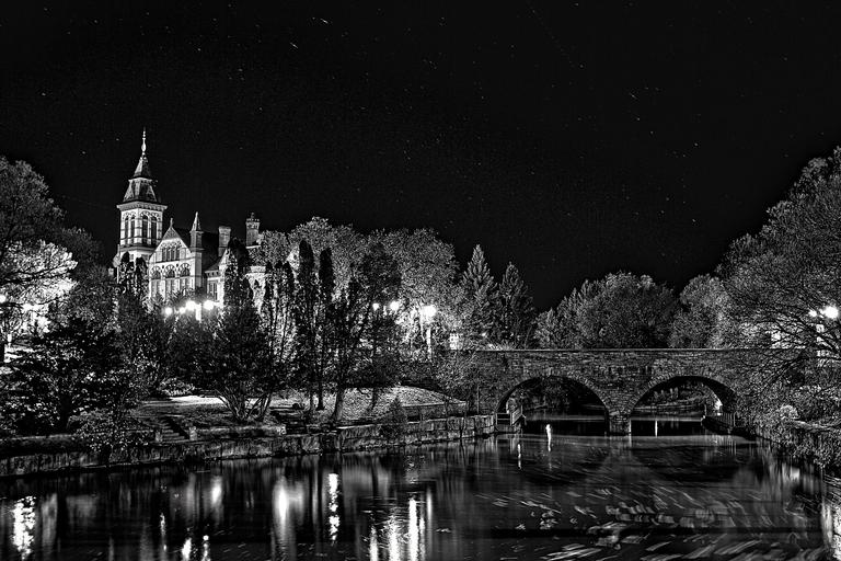 Keywords: church river bridge night water reflection building riverbank trees dark street lights lanterns stars shining cathedral acrchitecture calm mirror glassy surface black and white