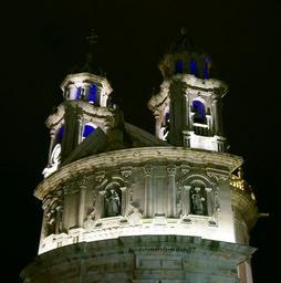 Keywords: church spain pontevedra night blue yellow peregrina rock facade tower jakobsweg