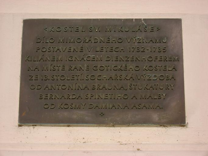 | Keywords: Church-of-St-Nicholas-Old-Town-Prague-plaque.jpg  en Plaque “ Church of St Nicholas of Old Town in Prague Czech Republic Kostel svatĂ©ho Mikuláše StarĂ© MÄ›sto kostela svatĂ©ho Mikuláše cs Praha-StarĂ© MÄ›sto <br />Text Kostel sv Mikuláše DĂlo mimořádnĂ©ho vĂ˝znamu postavenĂ© v letech 1732 “1735 Kiliánem Ignácem Dienzenhoferem na mĂstÄ› ranÄ› gotickĂ©ho kostela ze 13 stoletĂ SochaĹ™ská vĂ˝zdoba od AntonĂna Brauna štukatury Bernarda Spinetiho a malby od Kosmy Damiana Asama own photo Jirka23 2011-05-25 50 05 16 0 N 14 25 10 6 E type landmark_region CZ_heading E Cc-zero Church of St Nicholas of Old Town in Prague Plaques in Old Town Prague Place legend boards in Prague |