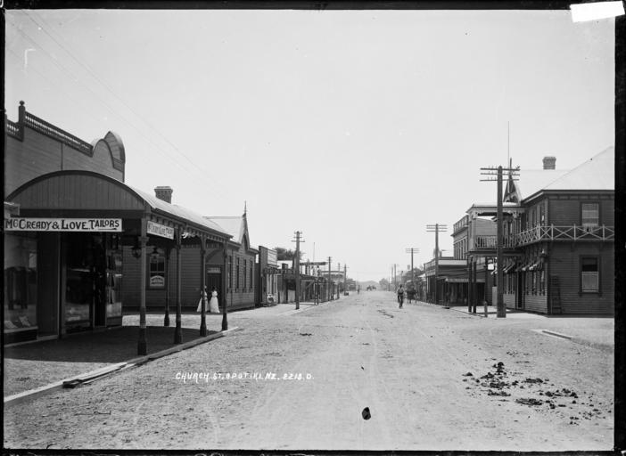 | Keywords: View looking down Church Street (now known as Elliot Street) with the Royal Hotel on the right; McCready & Love (tailors), Mechanics Institute; dentist, saddler, and other businesses on the left. The Masonic Hotel can be seen in the far distance on the left. Two women are standing at the entrance to the Mechanics Institute; a pram is on the footpath outside the dentist; a cyclist is heading towards the photographer and horseriders can be seen in the far distance. Photograph taken by William A Price in early 1900s. Inscriptions: Inscribed - Photographer's title on negative -bottom centre: Church St. Opotiki, NZ. 2213D. Quantity: 1 b&w original negative(s). Physical Description: Dry plate glass negative 4.5 x 6.5 inches Church Street, Opotiki. Price, William Archer, 1866-1948 :Collection of post card negatives. Ref: 1/2-001237-G. Alexander Turnbull Library, Wellington, New Zealand. natlib.govt.nz/records/22892228 View looking down Church Street (now known as Elliot Street) with the Royal Hotel on the right; McCready & Love (tailors), Mechanics Institute; dentist, saddler, and other businesses on the left. The Masonic Hotel can be seen in the far distance on the left. Two women are standing at the entrance to the Mechanics Institute; a pram is on the footpath outside the dentist; a cyclist is heading towards the photographer and horseriders can be seen in the far distance. Photograph taken by William A Price in early 1900s. Inscriptions: Inscribed - Photographer's title on negative -bottom centre: Church St. Opotiki, NZ. 2213D. Quantity: 1 b&w original negative(s). Physical Description: Dry plate glass negative 4.5 x 6.5 inches Church Street, Opotiki. Price, William Archer, 1866-1948 :Collection of post card negatives. Ref: 1/2-001237-G. Alexander Turnbull Library, Wellington, New Zealand. natlib.govt.nz/records/22892228 |