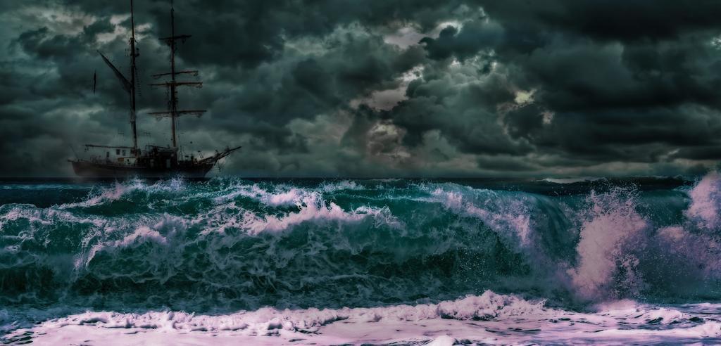 Keywords: churning troubled water ocean critical situation scene sailing ship hazard storm night weather waves dramatic danger dangerous moody foam thick clouds sky sea extreme composing