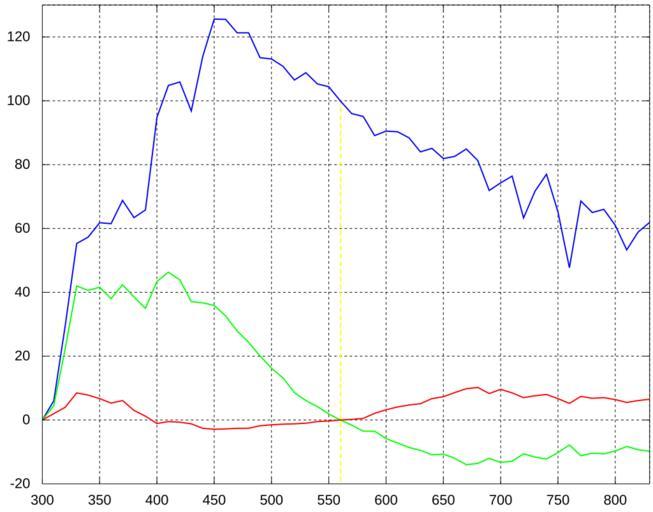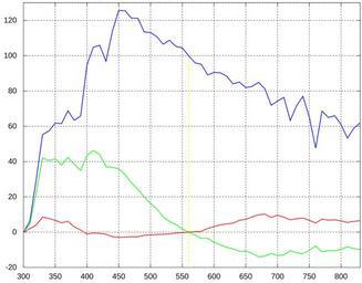 Keywords: CIE illuminants D components.svg Components of CIE daylight illuminant The mean is in blue S0 and the first two characteristic vectors are in green S1 and red S2 Own 2008-04-06 Adoniscik Standard illuminant