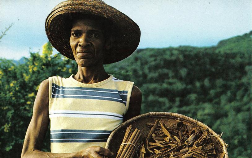 | Keywords: Cinnamon quill maker Seychelles.jpg  Cinnamon quill-maker displays her wares a tied up boundle of quills and a sample of scrapped cinnamon bark Scanned from the photo album Maxime Fayon Seychelles Photo Eden Victoria Seychelles 1977 early 1970s Photography by Dino Sassi - Marcel Fayon Photo Eden LTD Public domain according to the law of the Seychelles PD-Seychelles Culture of the Seychelles People of the Seychelles Economy of the Seychelles Cinnamomum verum Quills Cinnamon spice Cinnamon sticks People wearing straw hats |