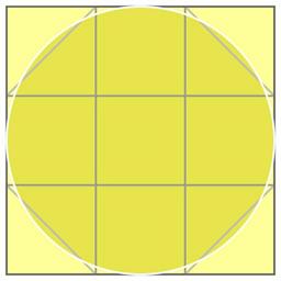 | Keywords: Circle in square Egyptian.svg en A square with inscribed circle and subdivided into parts by a grid illustrating an ancient method of calculating a circular area by approximation As demonstrated in the Rhind Papyrus book II problem 48 copied by Ahmes/Ahmose around 1550 BC The area of a circle is estimated as roughly 7/9 of a square whose side equals the circle's diameter i e pi is approximated by 28/9 3 111 de Ein Kreis der einem Quadrat eingeschrieben ist das dreiteilend durch ein Gitter zerlegt wird Zur Illustration der näherungsweisen Berechnung einer Kreisfläche nach der im Papyrus Rhind überlieferten Methode als Kopie durch Ahmes/Ahmose etwa 1550 v Chr Die Fläche eines Kreises wird damit auf ungefähr 7/9 der eines Quadrats geschätzt dessen Seitenlänge gleich dem Kreisdurchmesser ist; die Zahl pi wird hierbei angenähert durch 28/9 3 111 own R elation 2011-01-21 Other fields a text editor 43737 487 d e Cc-zero Circle area Rhind Mathematical Papyrus SVG Ancient Egypt |