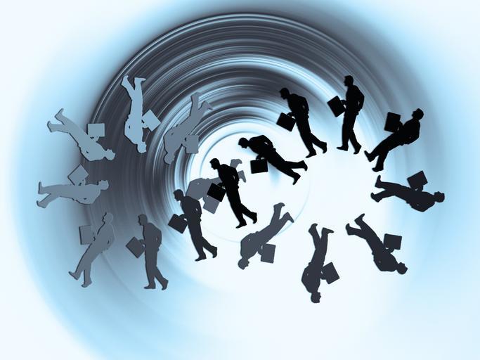 Keywords: circuit man silhouette businessman briefcase monotony everyday life endless eight loop infinity symbol icon form tile characteristic indicator feature stamp signum characters pictogram