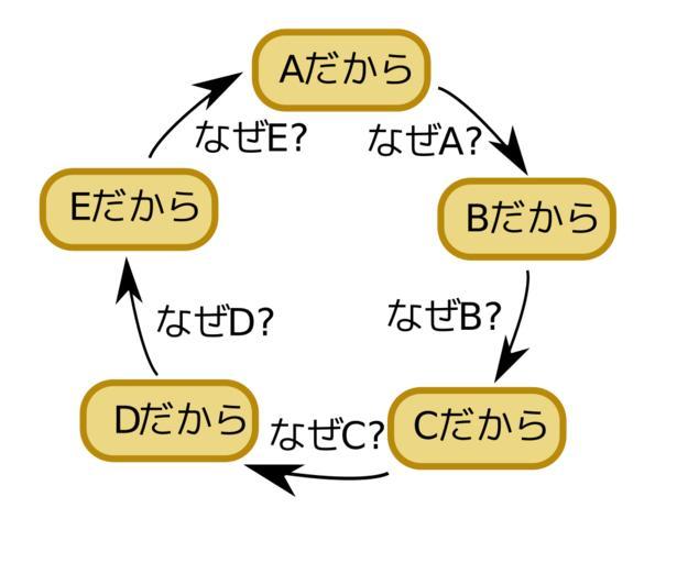 Keywords: Circular argument ja.svg en diagram represent Circular argument in Japanese I made diagram based on Toshihiko Miura Ronrigaku ga wakaru jiten Introduction to Logic pp 220-221 ISBN 4534037104 by Inkscape Propositional logic