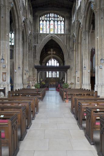 Keywords: cirencester uk interior st john the baptist church architecture ancient wooden pews carved ends stained glass windows rood screen polished stone floor