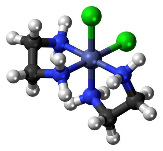 Keywords: Cis-Dichlorobis(ethylenediamine)cobalt(III) cation 3D ball.png Ball-and-stick model of the cis-dichlorobis ethylenediamine cobalt III complex This image shows the Λ lambda isomer as a cation positive charge Colour code 505050 Carbon C black<br> F0F0F0 Hydrogen H white<br> 3C50FA Nitrogen N blue<br> 14F014 Chlorine Cl green<br> 7078C0 Cobalt Co grey-blue<br> 2011-06-15 own DS Visualizer Jynto talk Cationic form space-filling version Chloride salt ball-and-stick version Chloride salt space-filling version cc-zero cobalt complexes ethylenediamino complexes chloro complexes Complex cations Images by Jynto Ball-and-stick models |
