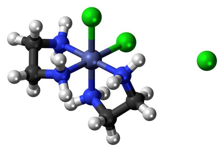 Keywords: Cis-Dichlorobis(ethylenediamine)cobalt(III) chloride 3D ball.png Ball-and-stick model of the cis-dichlorobis ethylenediamine cobalt III complex This image shows the Λ lambda isomer as a chloride salt Colour code 505050 Carbon C black<br> F0F0F0 Hydrogen H white<br> 3C50FA Nitrogen N blue<br> 14F014 Chlorine Cl green<br> 7078C0 Cobalt Co grey-blue<br> 2011-06-15 own DS Visualizer Jynto talk Cationic form ball-and-stick version Cationic form space-filling version Chloride salt space-filling version cc-zero cobalt complexes ethylenediamino complexes chloro complexes Images by Jynto Ball-and-stick models |