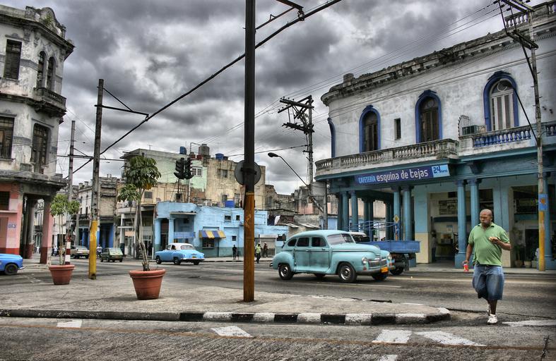 Keywords: city cars houses street building transit traffic asphalt architecture calzada walk pedestrian crossing cuba havana antique car urban capital corner clouds people