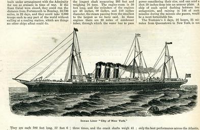 | Keywords: boy's own paper boysownpaper 1890s drawing outdoor photo border Boy's Own Paper, 1892 City of New York was a British built passenger liner of the Inman Line that was designed to be the largest and fastest liner on the Atlantic. When she entered service in August 1888, she was the first twin screw express liner and while she did not achieve the westbound Blue Riband, she ultimately held the eastbound record from August 1892 to May 1893 at a speed of 20.11 knots. City of New York, and her sister ship, City of Paris, are considered especially beautiful ships and throughout their careers were rivals to the White Star Teutonic and Majestic. In February 1893, the Inman Line was merged into the American Line and by act of Congress, the renamed New York was transferred to the US flag. Beginning in the mid-1890s, New York and Paris were paired with St Louis and St Paul to form one of the premier Atlantic services. New York continued with the American Line until 1920 and was broken for scrap in 1923. She served the US Navy as Harvard during the Spanish American War and Plattsburg in World War I. She is also remembered for nearly colliding with the RMS Titanic as the latter ship began her doomed maiden voyage in 1912. Boy's Own Paper, 1892 City of New York was a British built passenger liner of the Inman Line that was designed to be the largest and fastest liner on the Atlantic. When she entered service in August 1888, she was the first twin screw express liner and while she did not achieve the westbound Blue Riband, she ultimately held the eastbound record from August 1892 to May 1893 at a speed of 20.11 knots. City of New York, and her sister ship, City of Paris, are considered especially beautiful ships and throughout their careers were rivals to the White Star Teutonic and Majestic. In February 1893, the Inman Line was merged into the American Line and by act of Congress, the renamed New York was transferred to the US flag. Beginning in the mid-1890s, New York and Paris were paired with St Louis and St Paul to form one of the premier Atlantic services. New York continued with the American Line until 1920 and was broken for scrap in 1923. She served the US Navy as Harvard during the Spanish American War and Plattsburg in World War I. She is also remembered for nearly colliding with the RMS Titanic as the latter ship began her doomed maiden voyage in 1912. |