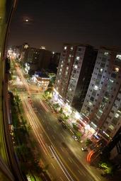 Keywords: city street fish eye night buildings road moon