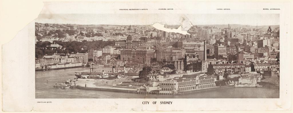 | Keywords: archives state records nsw staterecordsnsw newsouthwales blackandwhite city monochrome black and white Title: City of sydney - Circular Quay, Colonial Secretary's Office, Custom's House, Lands Office, Hotel Australia Dated: c.1915 Digital ID: NRS20499_a050_000005 Series: NRS 20499 Most up-to-date Sydney panoramic views Rights: No known copyright restrictions www.records.nsw.gov.au/about-us/rights-and-permissions We'd love to hear from you if you use our photos/documents. Many other photos in our collection are available to view and browse on our website using Photo Investigator. Title: City of sydney - Circular Quay, Colonial Secretary's Office, Custom's House, Lands Office, Hotel Australia Dated: c.1915 Digital ID: NRS20499_a050_000005 Series: NRS 20499 Most up-to-date Sydney panoramic views Rights: No known copyright restrictions www.records.nsw.gov.au/about-us/rights-and-permissions We'd love to hear from you if you use our photos/documents. Many other photos in our collection are available to view and browse on our website using Photo Investigator. |