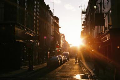 Keywords: city town sunset houses urban road buildings windows street cars cobblestone people walking puddle stores shops signs sunrays sunlight
