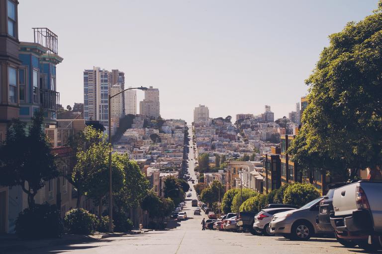 Keywords: city urban road street cars parked residential buildings huses apartments cityscape downtown hill trees