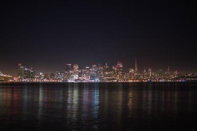 Keywords: cityscape waterfront skyline night illuminated street lights city architecture urban water downtown river skyscraper modern view reflection metropolis