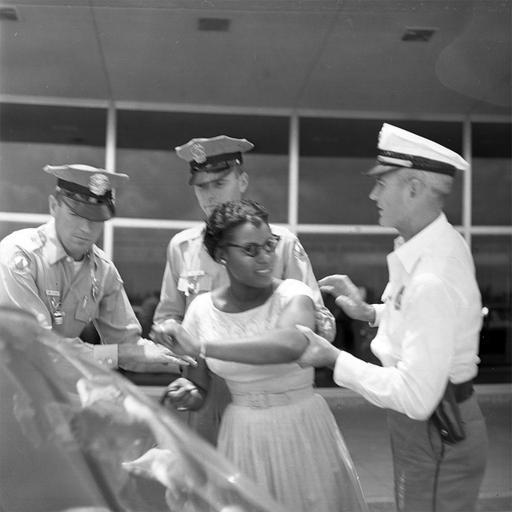 | Keywords: florida tallahassee tallahassee regional airport tallahasseeregionalairport priscilla stephens kruize priscillastephenskruize arrests police officers policeofficers political activists politicalactivists discrimination segregation african american women africanamericanwomen civil rights civilrights congress of racial equality congressofracialequality blackandwhite monochrome black and white Persistent URL: floridamemory.com/items/show/267341 Local call number: TD01484M Title: Civil rights activist Priscilla Stephens being arrested - Tallahassee Date: June 16, 1961 Physical descrip: 1 photonegative - b&w - 60 mm. Series Title: Tallahassee Democrat Collection Repository: State Library and Archives of Florida 500 S. Bronough St., Tallahassee, FL, 32399-0250 USA, Contact: 850.245.6700, Archives@dos.myflorida.com Persistent URL: floridamemory.com/items/show/267341 Local call number: TD01484M Title: Civil rights activist Priscilla Stephens being arrested - Tallahassee Date: June 16, 1961 Physical descrip: 1 photonegative - b&w - 60 mm. Series Title: Tallahassee Democrat Collection Repository: State Library and Archives of Florida 500 S. Bronough St., Tallahassee, FL, 32399-0250 USA, Contact: 850.245.6700, Archives@dos.myflorida.com |