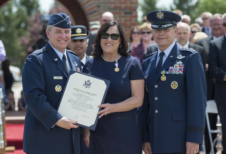 | Keywords: CJCS retires TRANSCOM Commander 140505-D-KC128-283.jpg en From left Chief of Staff of the U S Air Force Gen Mark A Welsh III presents an award to Beverly Fraser the wife of Gen William M Fraser III during her husband s change of command and retirement ceremony May 5 2014 at Scott Air Force Base Ill Fraser served as the commander of U S Transportation Command before retiring from the Air Force after 40 years of service DoD photo by Mass Communication Specialist 1st Class Daniel Hinton U S Navy/Released 2014-05-05 Petty Officer 1st Class Daniel Hinton https //www dvidshub net/image/1320820 140505-D-KC128-283 2014-05-07 10 05 SCOTT AIR FORCE BASE IL US PD-USGov Mark A Welsh III Scott Air Force Base Images from DoD uploaded by Fæ |